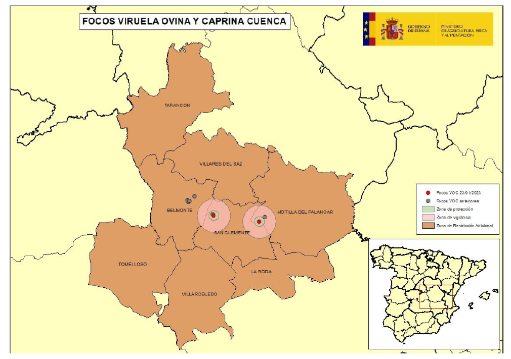 Los Servicios Veterinarios Oficiales (SVO) de la Junta de Castilla-La Mancha mantienen una vigilancia intensificada sobre la Viruela Ovina y Caprina (VOC) en las explotaciones de ovino localizadas en los municipios de La Alberca y Tébar, en la provincia de Cuenca, donde se detectaron los dos últimos focos de la enfermedad el pasado mes de noviembre de 2022.