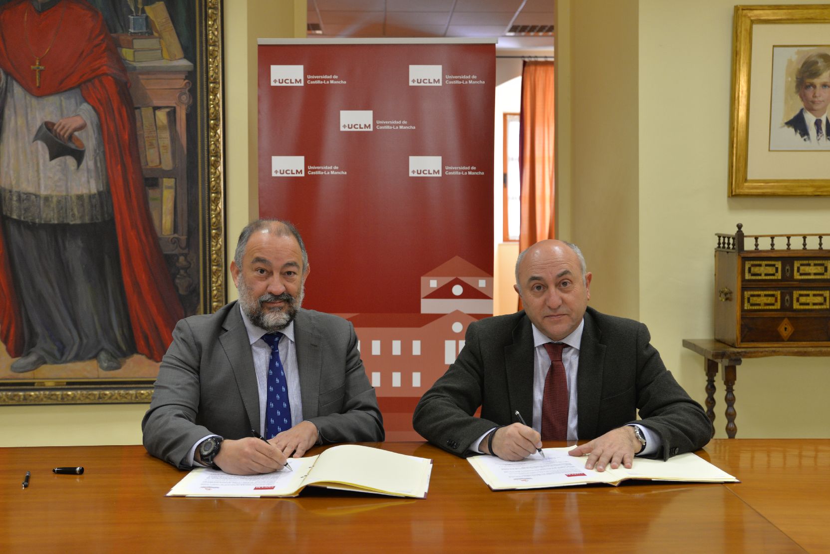 El rector de la UCLM, Julián Garde y el presidente de Asiccaza, Florencio Rodríguez, han firmado la renovación del convenio marco de colaboración entre ambas entidades para el fomento de actividades de investigación en el ámbito cinegético y de la seguridad alimentaria.