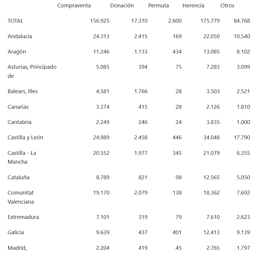 El número de fincas heredadas ascendió a 175.779; 17.310 fueron donadas; 2.600 transmitidas por una permuta y 84.768 por otros medios.