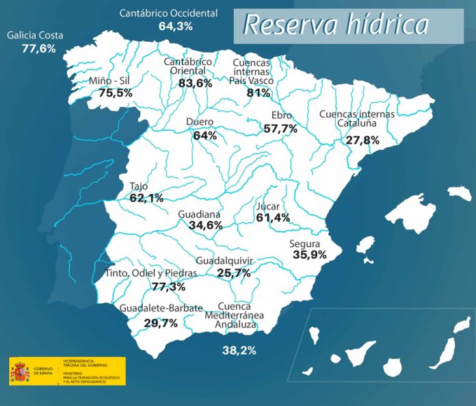 La reserva hídrica española está al 50,7 por ciento de su capacidad total. Los embalses almacenan actualmente 28.455 hectómetros cúbicos (hm³) de agua, aumentando en la última semana en 160 hectómetros cúbicos (el 0,3 por ciento de la capacidad total actual de los embalses).