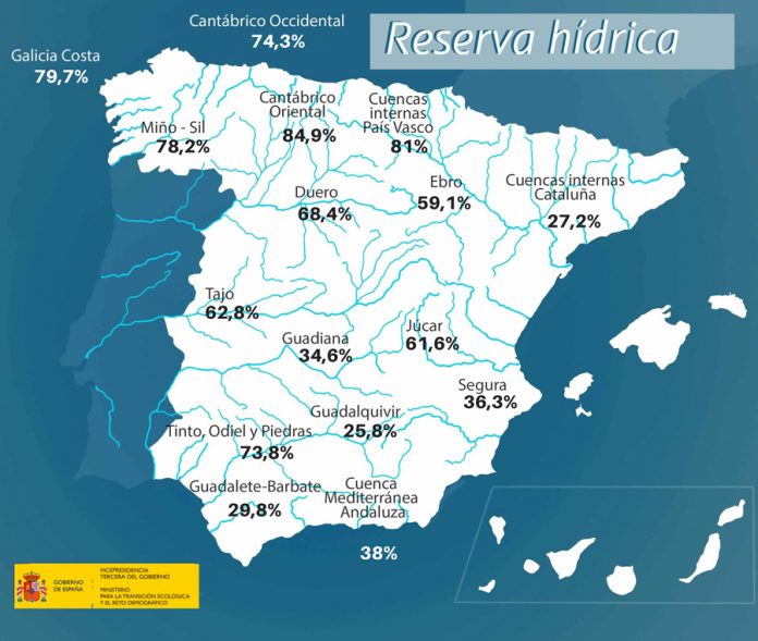 La reserva hídrica española está al 51,7 por ciento de su capacidad total. Los embalses almacenan actualmente 28.971 hectómetros cúbicos (hm³) de agua, aumentando en la última semana en 241 hectómetros cúbicos (el 0,4 por ciento de la capacidad total actual de los embalses).
