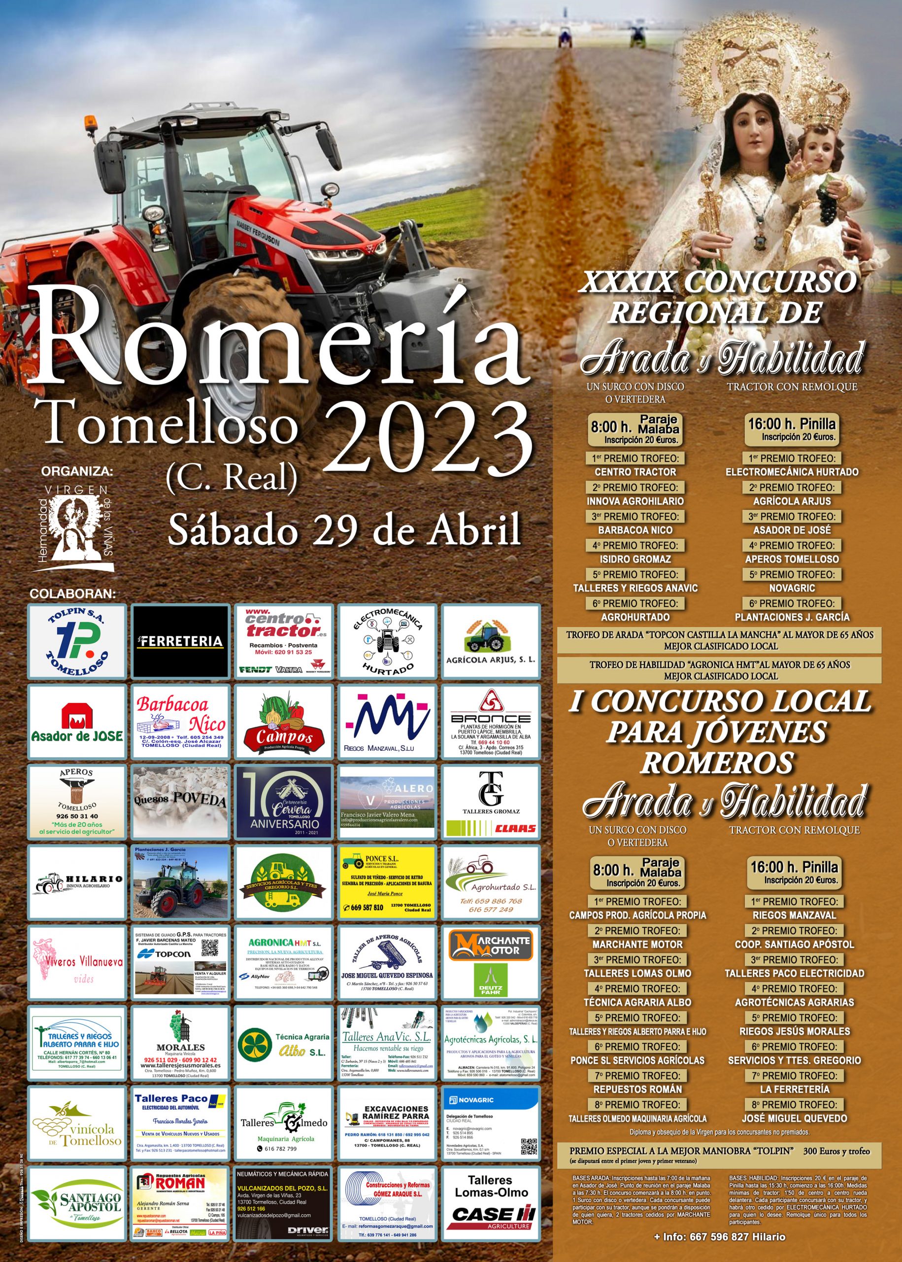 La Hermandad de la Virgen de las Viñas, de Tomelloso, convoca sus concursos de arada y habilidad con tractor, que tendrá lugar el sábado 29 de abril.