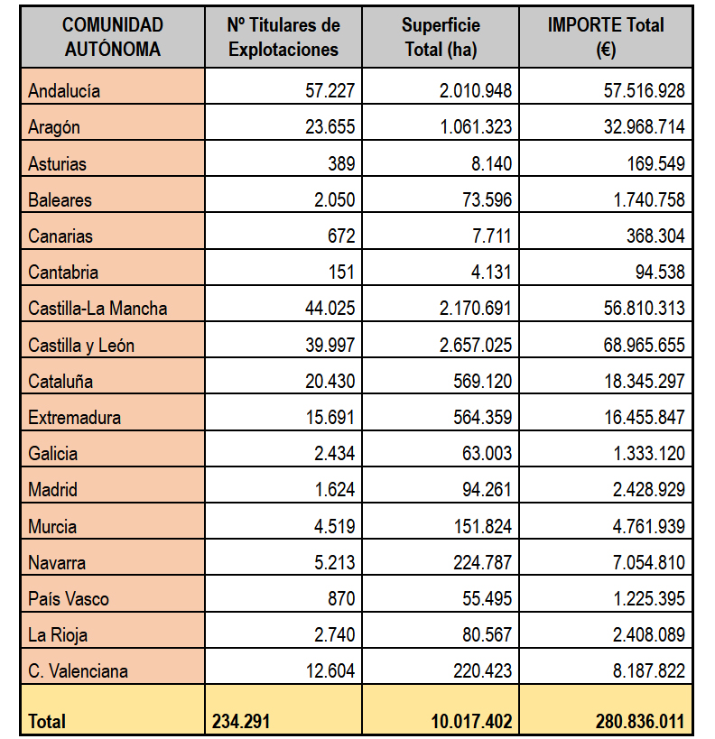 El importe total asciende a 280.836.010 euros que se reparten entre los 234.291 titulares de explotaciones agrícolas que figuran en el listado definitivo publicado el pasado 31 de marzo por el Fondo Español de Garantía Agraria (FEGA).