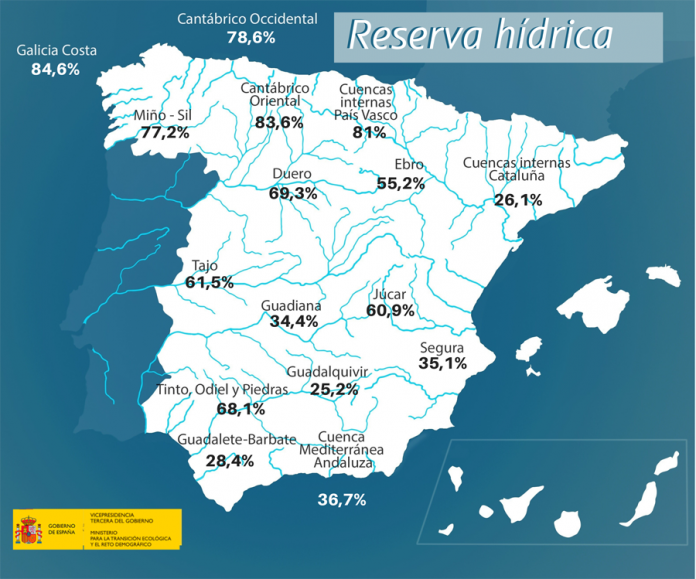La reserva hídrica española está al 50,7 por ciento de su capacidad total. Los embalses almacenan actualmente 28.400 hectómetros cúbicos (hm³) de agua, disminuyendo en la última semana en 282 hectómetros cúbicos (el 0,5 por ciento de la capacidad total actual de los embalses).