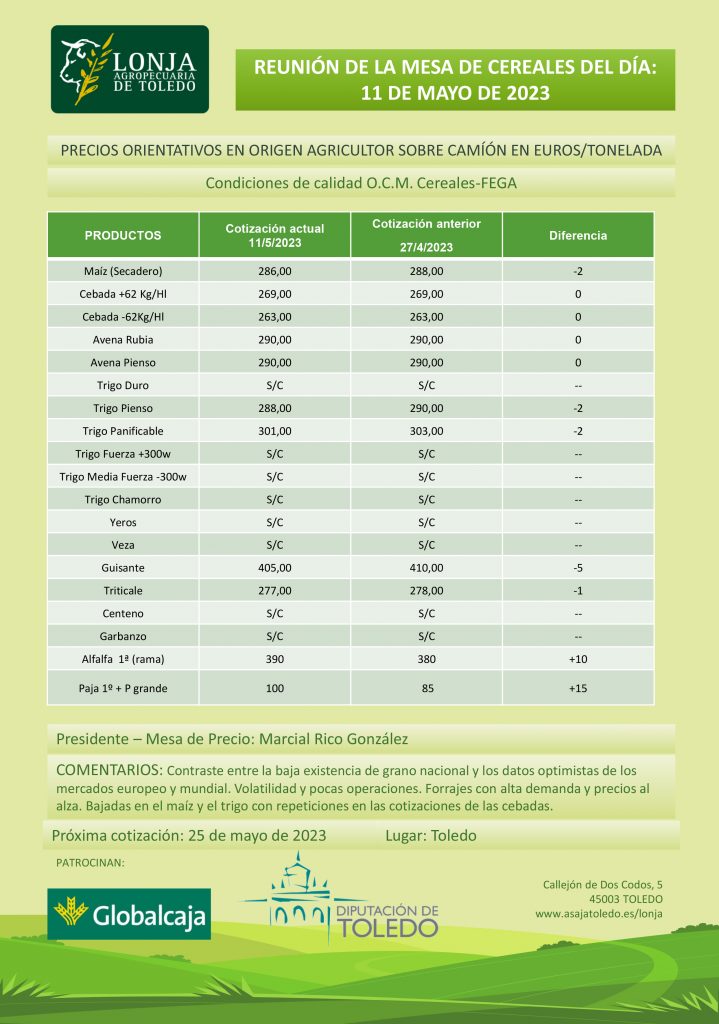 Lonja Agropecuaria de Toledo. Cereales. 11-mayo-2023