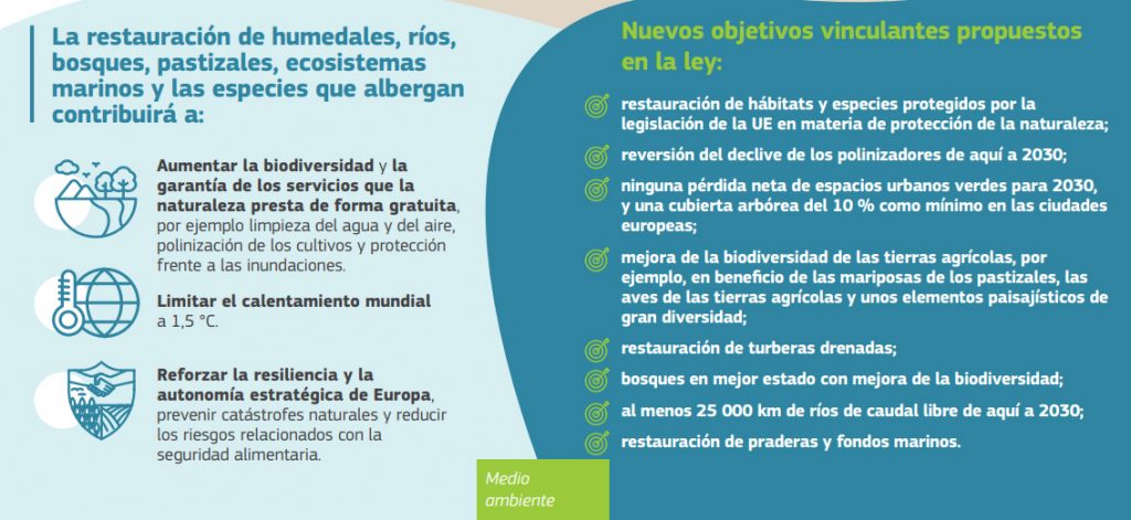 Establece asimismo una serie de objetivos específicos, a alcanzar en marcos temporales definidos, para la restauración de ecosistemas terrestres, costeros y de agua dulce; ecosistemas marinos; ecosistemas urbanos; conectividad de ríos y de las funciones naturales de las llanuras de inundación; poblaciones de insectos polinizadores; ecosistemas agrícolas, y ecosistemas forestales. Igualmente, incorpora la obligación para los Estados miembros de desarrollar Planes Nacionales de Restauración en donde deberán implementarse las obligaciones de la norma.