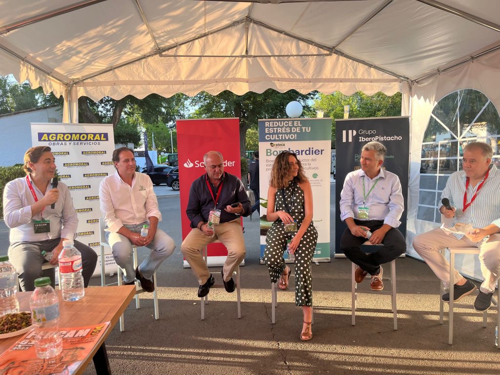 En la noche de este viernes, el stand acogía una charla sobre las nuevas tendencias para un sector agroalimentario más rentable, digital y sostenible, con la participación de Ginés Casanova, de Kimitec; Florencio Rodríguez, secretario general de ASAJA Ciudad Real; Alberto Obregón, de Agromillora; Claudia Calzada, de Iberopistacho; y Pedro Bergillos, responsable Agro en Castilla-La Mancha, de Banco Santander. Antonio Gómez, editor de agroclm, moderaba la mesa redonda, en la que se abordaban temas de gran interés para el sector.