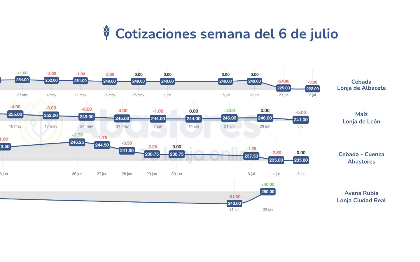 En el análisis semanal de Abastores app.abastores.com, las lonjas nacionales de Castilla y León están a la espera de la cosecha para establecer los precios. En León, el maíz ha experimentado una caída de 5€. Por otro lado, las lonjas de Castilla-La Mancha y Andalucía han comenzado a cotizar con una tendencia claramente bajista, con precios más bajos que al inicio del conflicto. En la siguiente infografía se puede observar la tendencia y los precios cotizados durante esta semana.