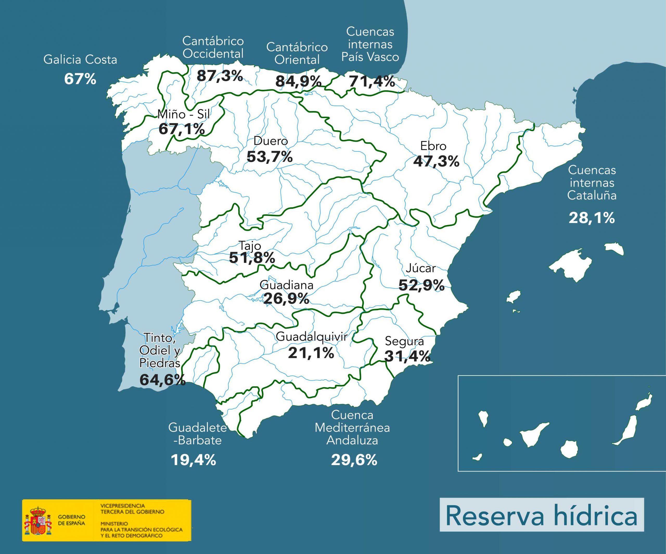 La reserva hídrica española está al 42,2 por ciento de su capacidad total. Los embalses almacenan actualmente 23.637 hectómetros cúbicos (hm³) de agua, disminuye en la última semana en 692 hectómetros cúbicos (el 1,2 por ciento de la capacidad total actual de los embalses).