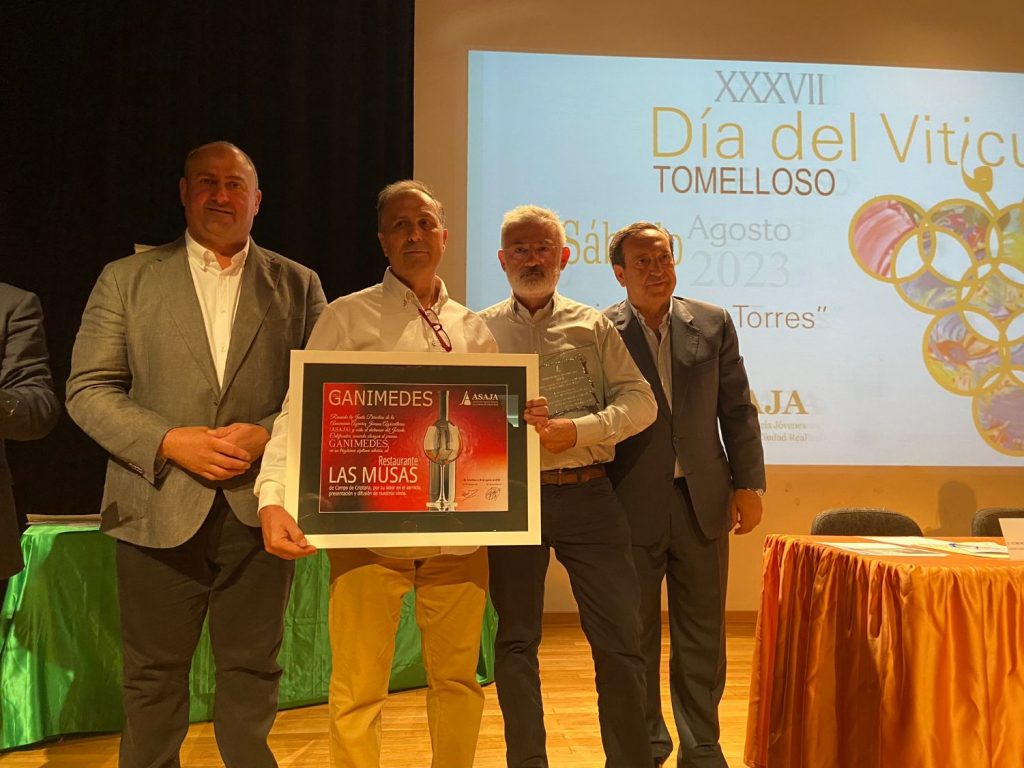 ASAJA también ha entregado su tradicional reconocimiento ‘Ganímedes’ al restaurante Las Musas, de Campo de Criptana. Ha recogido el premio su propietario, Carlos Ortega, y el sumiller del establecimiento, Reyes Ramírez, en reconocimiento a su labor desarrollada en la presentación, servicio y difusión del vino.