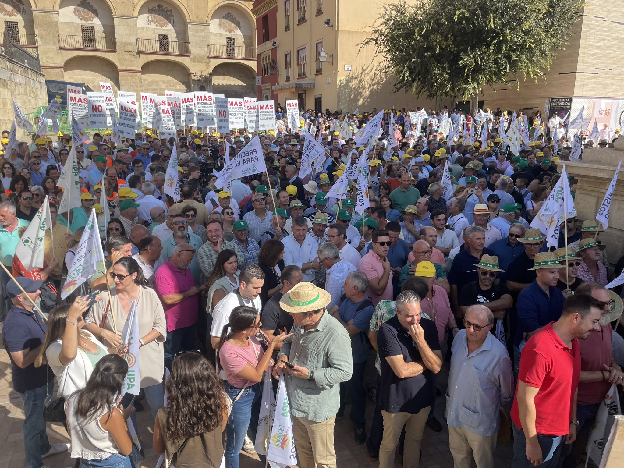 Más de 6.000 agricultores, ganaderos y cooperativistas llegados de toda España se sumaron este martes al acto de protesta convocado por ASAJA, COAG, UPA y Cooperativas Agro-alimentarias, en la Puerta del Puente de Córdoba.