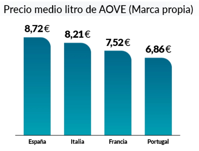 El precio medio del AOVE español es un 27% más caro que el que se vende en Portugal AOVE español, un 16% más que en Francia y un 6% más caro que el AOVE italiano.