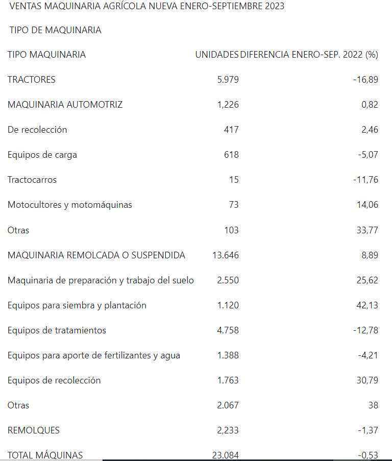 EFEAGRO. La venta de maquinaria nueva en España ha alcanzado las 23.084 unidades en los primeros nueve meses del año, el 0,53 % menos que en el mismo periodo de 2022 (23.206), según el avance del registro de inscripción de maquinaria del Ministerio de Agricultura, Pesca y Alimentación (MAPA).