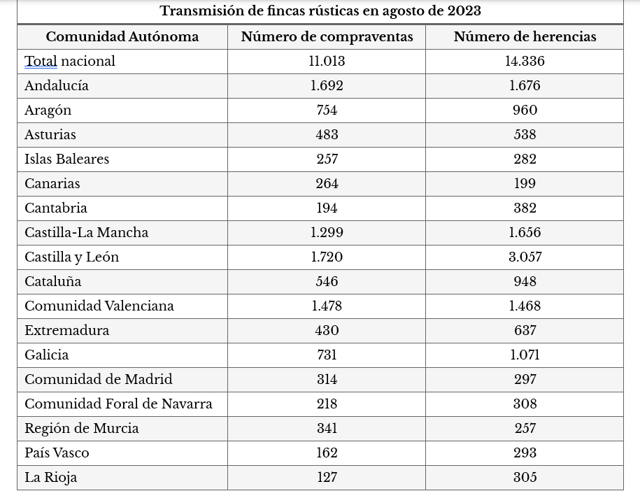 Según el Informe 2023 Cocampo sobre la Estructura del Suelo Rústico en España, el 41% de los titulares de fincas rústicas superan los 65 años. Este envejecimiento de los propietarios dispara las transmisiones de fincas rústicas, que alcanzaron un total 33.101 operaciones en el octavo mes del año, y que están provocando la fragmentación del suelo y el abandono de pequeñas explotaciones.