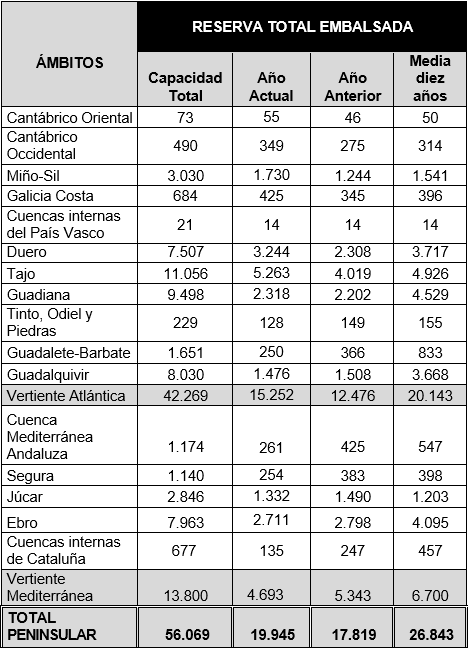La reserva hídrica española está al 35,6% de su capacidad total. Los embalses almacenan actualmente 19.945 hectómetros cúbicos (hm³) de agua, aumentando en la última semana en 577 hectómetros cúbicos (el 1,0% de la capacidad total actual de los embalses).