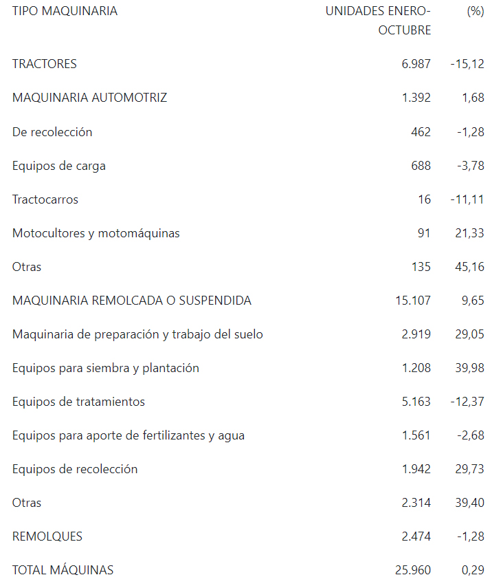 Solo en octubre, la venta de maquinaria agrícola nueva creció el 7,84 % en comparación con el mismo mes del año anterior, con 2.888 unidades, de las que 1.462 eran máquinas remolcadas o suspendidas (+17,43 %), 1.019 tractores (-1,83 %), 240 remolques (-0,83 %) y 167 maquinaria automotriz (+9,15 %).