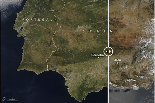 Tan grave es la situación, especialmente en Andalucía, que hasta la NASA se ha hecho eco del caso, la cual ha difundido una imagen tomada desde el satélite Terra, en la que se ve cómo “la sequía tiñe de marrón la mayor región productora de aceite de oliva del mundo”, según explica el consultor estratégico Juan Vilar.