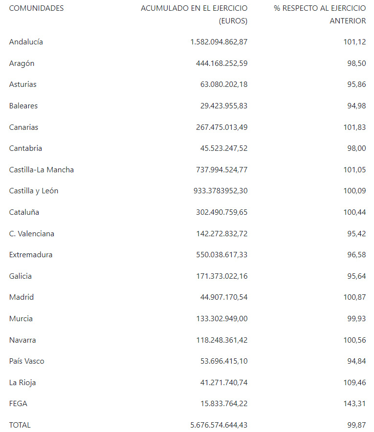 Desde que se inició dicho ejercicio, las comunidades que más ayudas han abonado son Andalucía (1.582 millones de euros), Castilla y León (933,3 millones), Castilla-La Mancha (737,9 millones), Extremadura (550 millones), Aragón (444,1 millones), Cataluña (302,5 millones), Canarias (267,5 millones) y Galicia (171,3 millones), según los datos del FEGA.