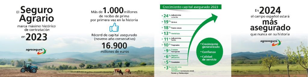 La contratación de seguros agrarios ha crecido un 16% en 2023 hasta los 1.011 millones de euros, según los datos registrados por Agroseguro hasta el 31 de diciembre de 2023. Es la primera vez que el sistema español de seguros agrarios supera los mil millones de euros de recibo de prima.