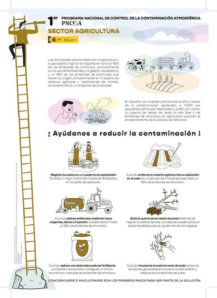 El documento recoge que las actividades relacionadas con la agricultura y la ganadería originan en España en torno al 90% de las emisiones de amoniaco, principalmente por el uso de fertilizantes y la gestión de estiércol, y un 35% de las emisiones de partículas, que tienen su origen principalmente en la quema de residuos agrícolas y operaciones de manejo, almacenamiento y transporte de productos.