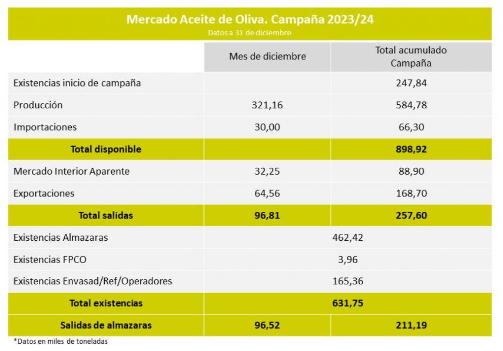 En el tercer mes de la campaña de comercialización 2023/24 destacan que la producción comunicada en el mes de diciembre es de 321.157,60 toneladas, con un acumulado en esta campaña de 584.780,48. Las salidas de aceite al mercado se situarían en esta ocasión en el entorno de las 96.760 toneladas.