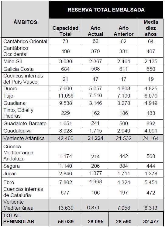 La reserva hídrica española está al 50,1% de su capacidad total. Los embalses almacenan actualmente 28.095 hectómetros cúbicos (hm³) de agua, disminuyendo en la última semana en 381 hectómetros cúbicos (el 0,7% de la capacidad total actual de los embalses).
