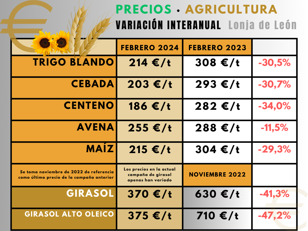 El centeno acumula en el último año una depreciación del 34 % y ya se paga en la Lonja de León a 186 euros/tonelada, prácticamente cien euros la tonelada menos que hace un año. Noventa euros la tonelada ha perdido en el último año la cebada: si en febrero de 2023 se cotizaba a 293 euros/tonelada, el último precio marcado en la lonja leonesa hace ya más de medio mes fue de 203 euros/tonelada, con una caída interanual del 30,7%.