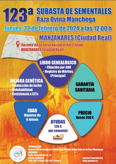 Este jueves, 22 de febrero, Manzanares (Ciudad Real) acoge la 123ª Subasta de Sementales de raza ovina manchega, organizada por la Asociación Nacional de Criadores de Ganado Ovino Selecto de Raza Manchega (AGRAMA).