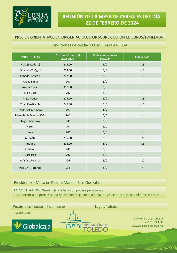 Lonja Agropecuaria de Toledo. Cereales. 22-febrero-2024