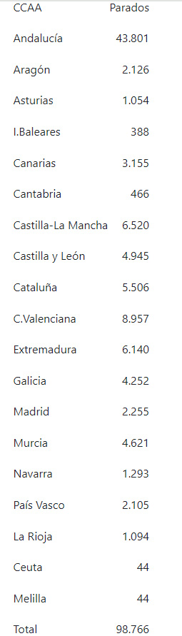 Por regiones, destaca Andalucía, con más de 43.000 y, por abajo, Ceuta y Melilla, con 44 en cada una de las ciudades autónomas.