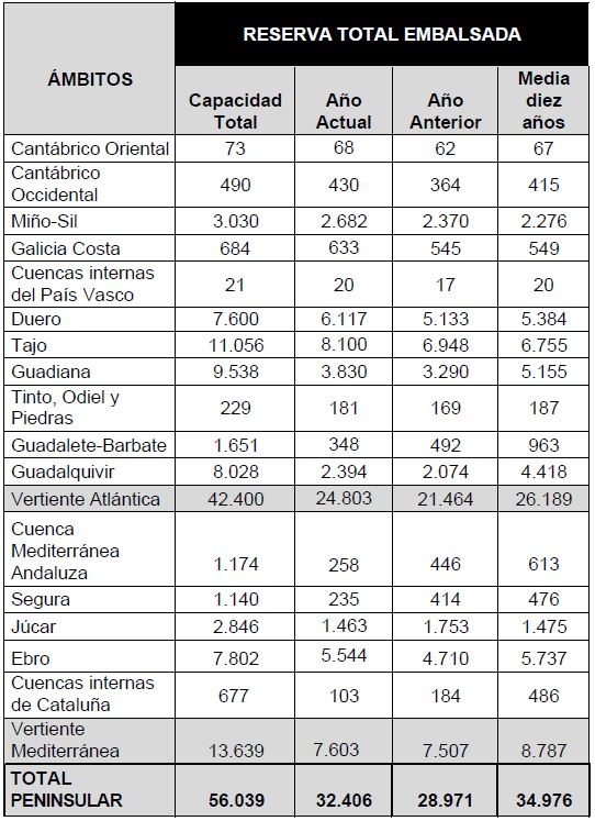 La reserva hídrica española está al 57,8% de su capacidad total. Los embalses almacenan actualmente 32.406 hectómetros cúbicos (hm³) de agua, aumentando en la última semana en 562 hectómetros cúbicos (el 1,0% de la capacidad total actual de los embalses).