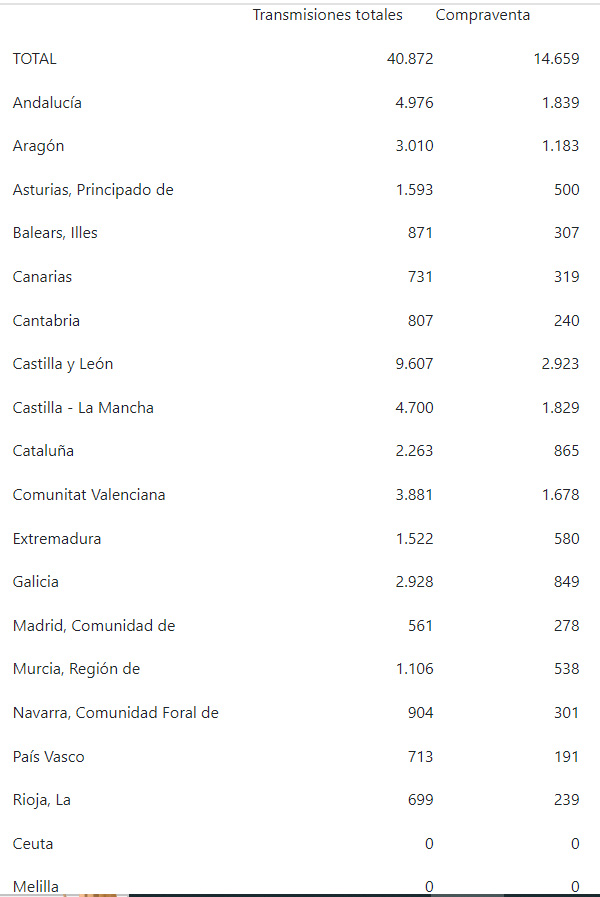 La Estadística de Transmisiones de Derechos de la Propiedad (ETDP) del INE detalla que en enero de 2024 se contabilizaron 40.872 transmisiones de fincas rústicas, entre las que, además de las compraventas, hay 15.908 herencias, 1.447 donaciones, 252 permutas y 8.606 operaciones de otro tipo.
