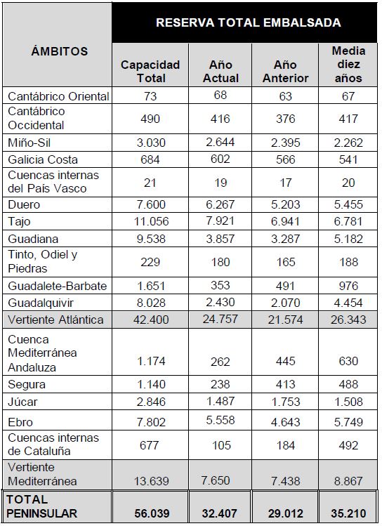 La reserva hídrica española está al 57,8% de su capacidad total. Los embalses almacenan actualmente 32.407 hectómetros cúbicos (hm³) de agua, disminuyendo en la última semana en 11 hectómetros cúbicos (el 0,0% de la capacidad total actual de los embalses).