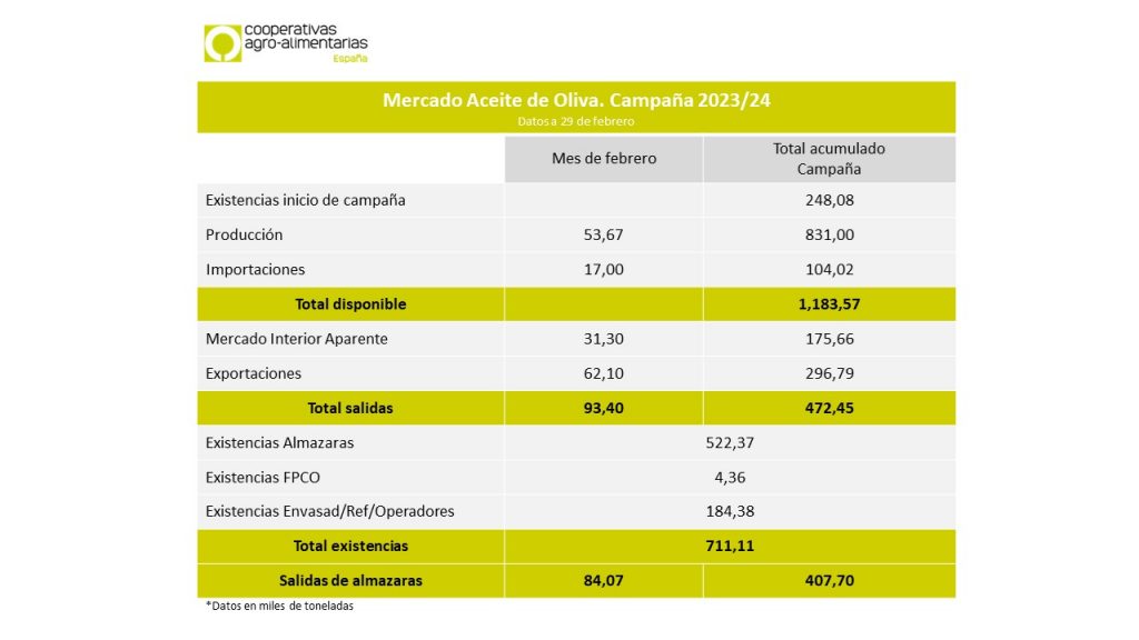 Las salidas de aceite al mercado durante el mes de febrero estimadas por el Ministerio son de 93.442 toneladas, superiores en casi 1.200 a las estimadas por Cooperativas.