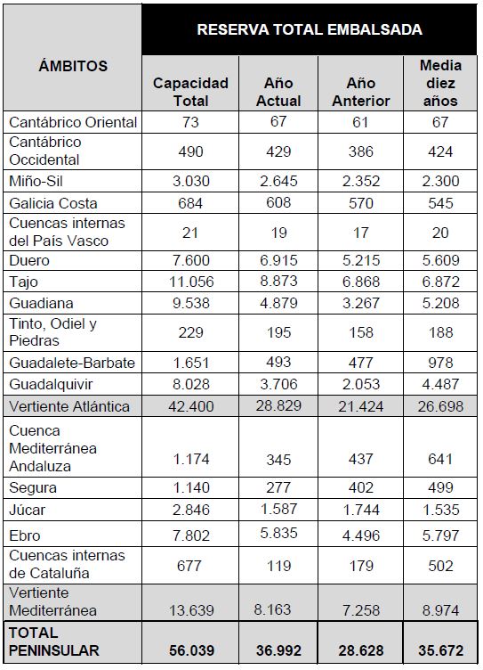 La reserva hídrica española está al 66% de su capacidad total. Los embalses almacenan actualmente 36.992 hectómetros cúbicos (hm³) de agua, aumentando en la última semana en 1.591 hectómetros cúbicos (el 2,8% de la capacidad total actual de los embalses).