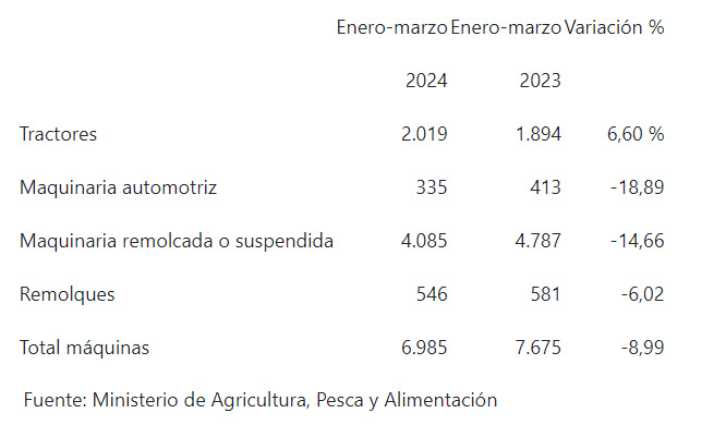 En este periodo, en el campo español se han vendido un total de 6.985 máquinas agrarias, lo que representa un descenso del 8,99 % con respecto a los tres primeros meses de 2023.