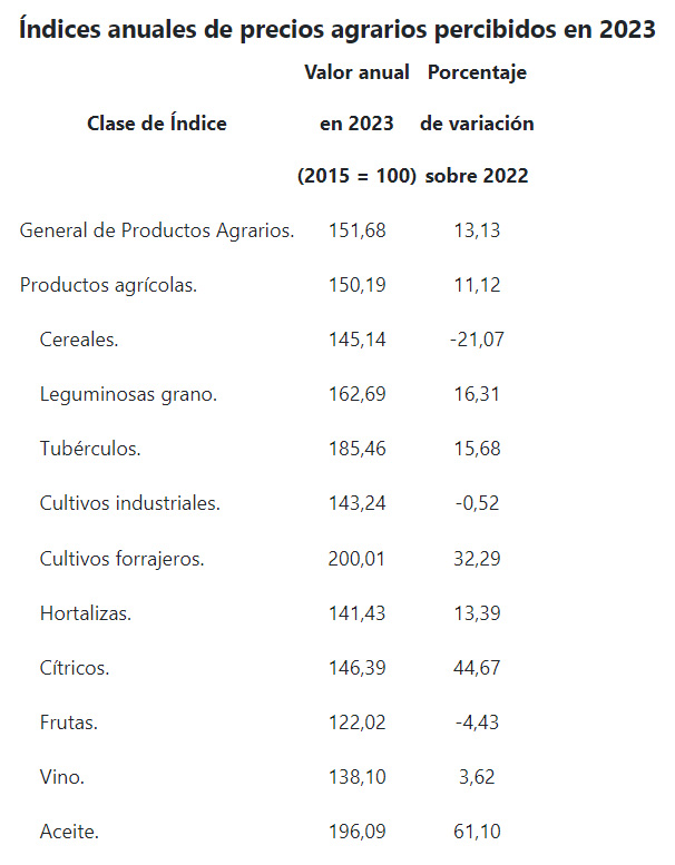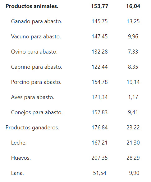 El índice específico de productos agrícolas se ha situado en 2023 en 150,19, un 11,12 % superior al de 2022; el de productos animales, en 153,77 (+16,04 %); y el de productos ganaderos, en 176,84 (+23,22 %).