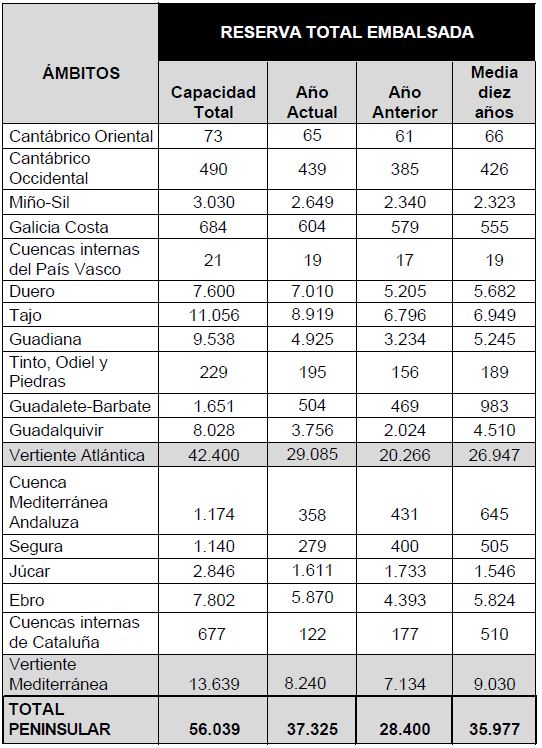 La reserva hídrica española está al 66,6% de su capacidad total. Los embalses almacenan actualmente 37.325 hectómetros cúbicos (hm³) de agua, aumentando en la última semana en 321 hectómetros cúbicos (el 0,6% de la capacidad total actual de los embalses).