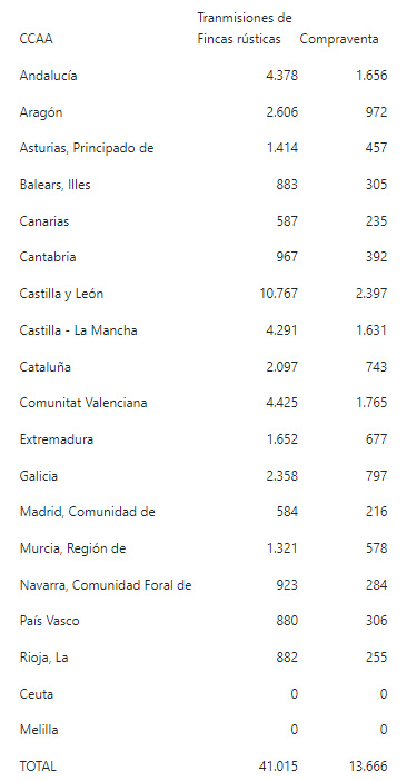 Castilla y León, con 10.767 operaciones, encabezó la lista de transmisiones de fincas rústicas y la de compraventas (2.397)
