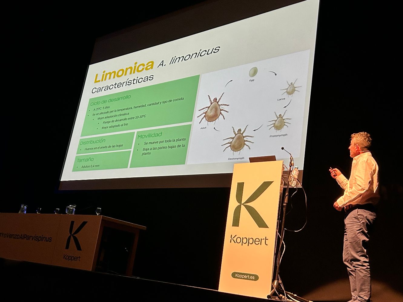 Limonica y Montdo Ulti-Mite fueron los protagonistas indiscutibles en el evento de presentación que se celebró ayer en el Auditorio de El Ejido con el título “Yo Venzo al Parvispinus con Koppert”. Ante más de 650 asistentes, principalmente asesores técnicos y productores, la investigadora Sarra Bouagga, perteneciente al departamento de I+D de Koppert España, presentó todos los detalles del proyecto de investigación que ha permitido identificar los puntos débiles de Thrips Parvispinus. La investigación ha requerido un esfuerzo extra, ya que fue necesario establecer una primera fase de conocimiento exhaustivo sobre la plaga debido a la escasa información científica que había disponible a nivel mundial.