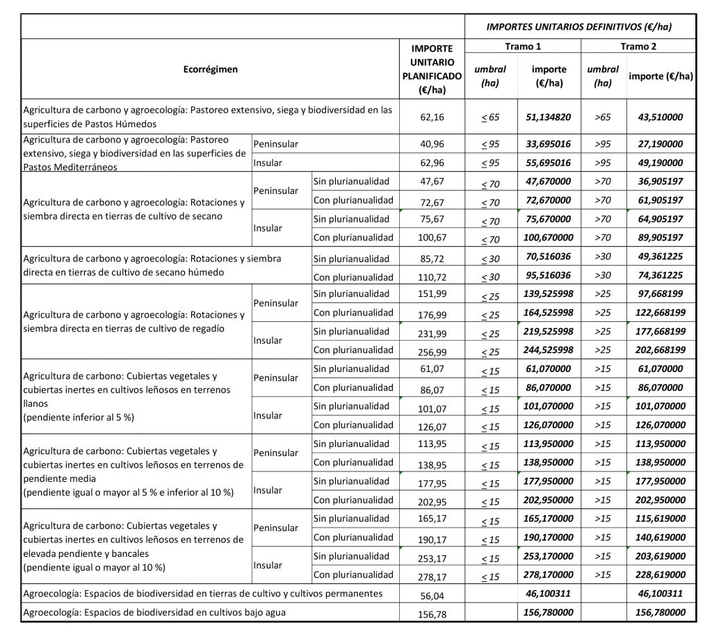 Estos importes unitarios definitivos se deberán aplicar, tanto a los pagos pendientes como a los pagos complementarios a los ya realizados con los importes provisionales, por que ya es posible abonar el cien por cien del total que recibirá el agricultor dentro de ese régimen de ayuda.