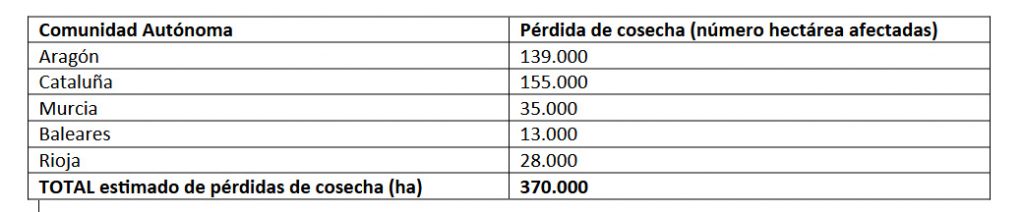 -En Aragón, principalmente en grandes áreas de Zaragoza y Teruel, se calculan unas pérdidas de 146.000 ha en las cuales no se va a poder cosechar y cerca de 175.000 ha con daños importantes. Los daños dependiendo de las comarcas oscilan entre el 50 y el 90%. Para muchas explotaciones puede ser el segundo año sin ingresos.