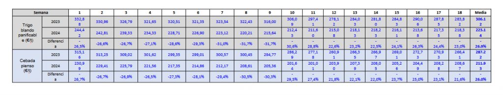 En lo que respecta a los precios percibidos por los agricultores podemos observar un descenso de los precios de los cereales de aproximadamente un 26% respecto a las mismas fechas del año anterior. Un ejemplo de ello lo encontramos en los precios de coyuntura semanales publicados por el ministerio de agricultura, al comparar las primeras 18 semanas de los años 2023 y 2024. En trigos, de una media de 306€/tonelada se ha pasado a 223€ y en cebadas de 287€/t a 211€.