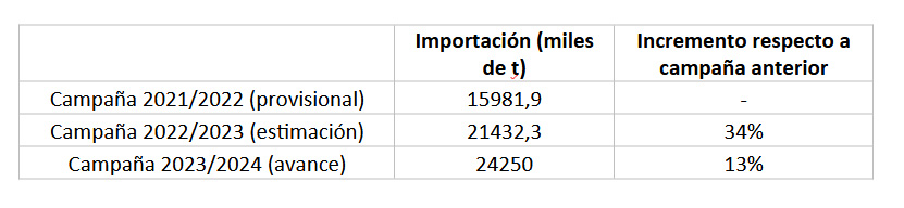 Situación que contrasta con el incremento de importación en los últimos años. Sólo el incremento de 2022 a 2023 supone un 23,6% hasta alcanzar los 23 M de toneladas. Además, si atendemos a los balances de campaña, la diferencia puede ser más notable.