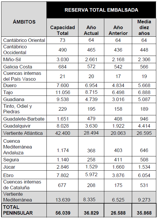 La reserva hídrica española está al 65,7% de su capacidad total. Los embalses almacenan actualmente 36.829 hectómetros cúbicos (hm³) de agua, disminuyendo en la última semana en 305 hectómetros cúbicos (el 0,5% de la capacidad total actual de los embalses).