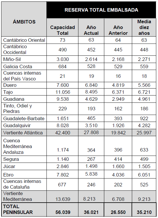 La reserva hídrica española está al 64,3% de su capacidad total. Los embalses almacenan actualmente 36.021 hectómetros cúbicos (hm³) de agua, disminuyendo en la última semana en 228 hectómetros cúbicos (el 0,4% de la capacidad total actual de los embalses).