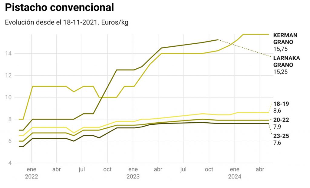 EE.UU. ha conseguido una campaña estable de precios, pese a su producción récord, gracias a un aumento de la demanda mundial por actores como India. Esa estabilidad en el pistacho americano se traslada automáticamente a mercados mucho más pequeños como el español.