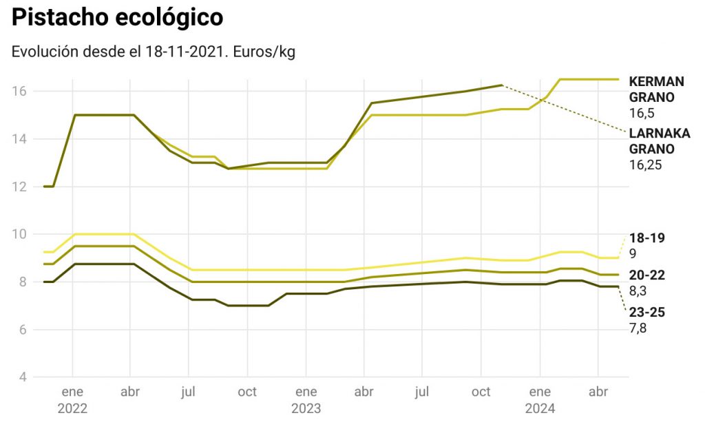 La falta de stock del pistacho ecológico, el apetito de la industria y la dudas que existen sobre la producción real de la siguiente cosecha en España hacen prever un incremento del precio en origen los próximos meses, según los operadores consultados.