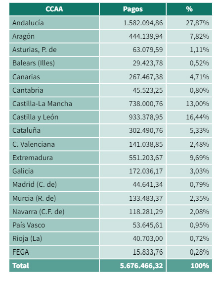 Por volumen de pagos, destaca como organismo pagador la comunidad autónoma de Andalucía, con un 27,87 % del total, seguido por el de Castilla y León, con un 16,44 %, y el de Castilla-La Mancha, con un porcentaje sobre el total de 13 %.