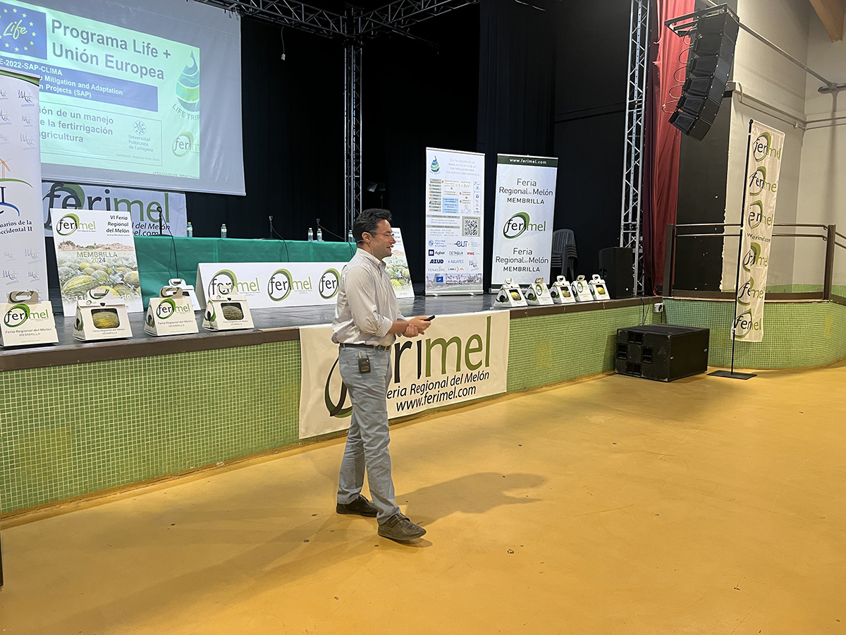 La ponencia versó sobre cómo optimizar el uso de agua y nutrientes en el cultivo del melón, a través de la digitalización y la agronomía, por Alejandro Pérez, catedrático de la Universidad Politécnica de Cartagena (UPCT), y coordinador de Life TRIPLET.